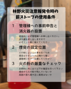 注意報発令当日、薪ストーブしか暖房器具をお持ちでない方に限り、以下の条件を全て満たす場合のみ使用を許可します。
