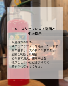 この緩和措置は、皆さまの「火の用心」への信頼のもとに成り立っています。一箇所の不始末がキャンプ場全体の存続に関わります。お一人おひとりが火災予防を徹底していただくようお願いいたします。